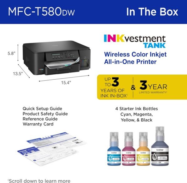- INNOVATIVE REFILLABLE INK TANK TECHNOLOGY: Brother Genuine no-spill bottles quickly refill the tank in 30 seconds for color, 65 seconds for black. The design prevents inserting the incorrect bottles for each color. Includes up to 3 years of ink in-box(1).