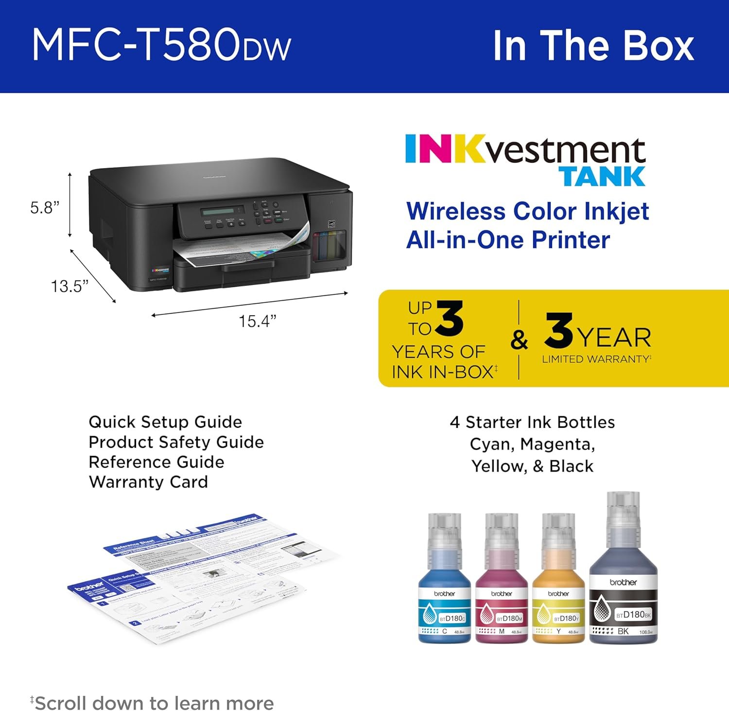 - CHOOSE BROTHER GENUINE INK: Reliable performance you can count on. Brother Genuine Ink is quality-tested to work seamlessly with your Brother printer. Choose Brother Genuine BTD180 Ink bottles, the only brand we recommend for use with your printer.