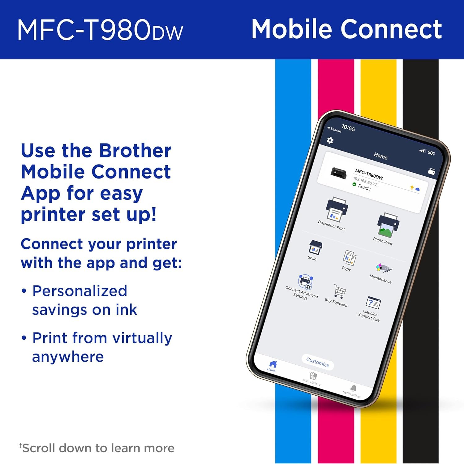 - THE BROTHER MOBILE CONNECT APP: Put the power of printing at your fingertips. Go mobile with the Brother Mobile Connect app(7) that delivers easy onscreen menu navigation for printing, copying, scanning, and device management from your mobile device.