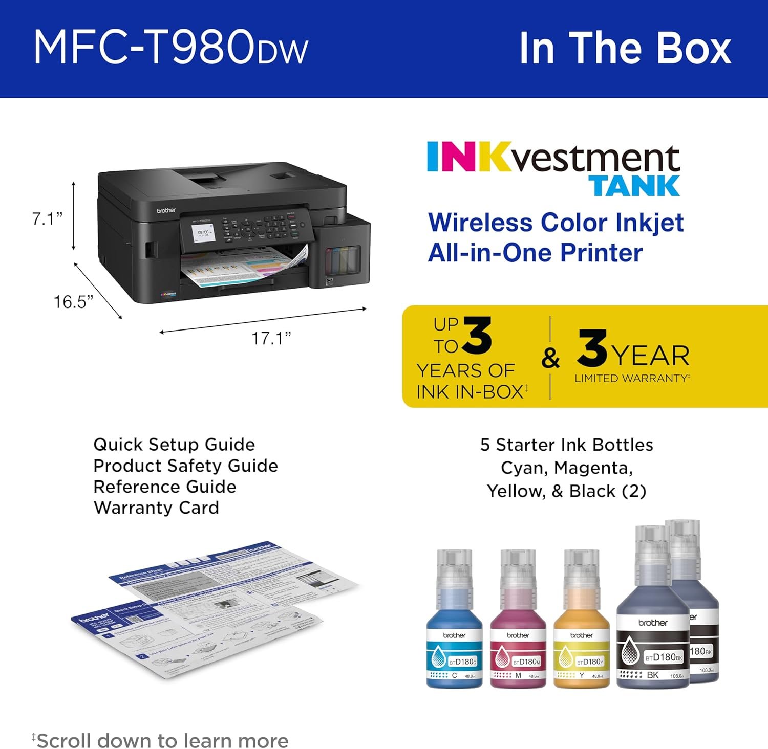 - CHOOSE BROTHER GENUINE INK: Reliable performance you can count on. Brother Genuine Ink is quality-tested to work seamlessly with your Brother printer. Choose Brother Genuine BTD180 Ink bottles, the only brand we recommend for use with your printer.