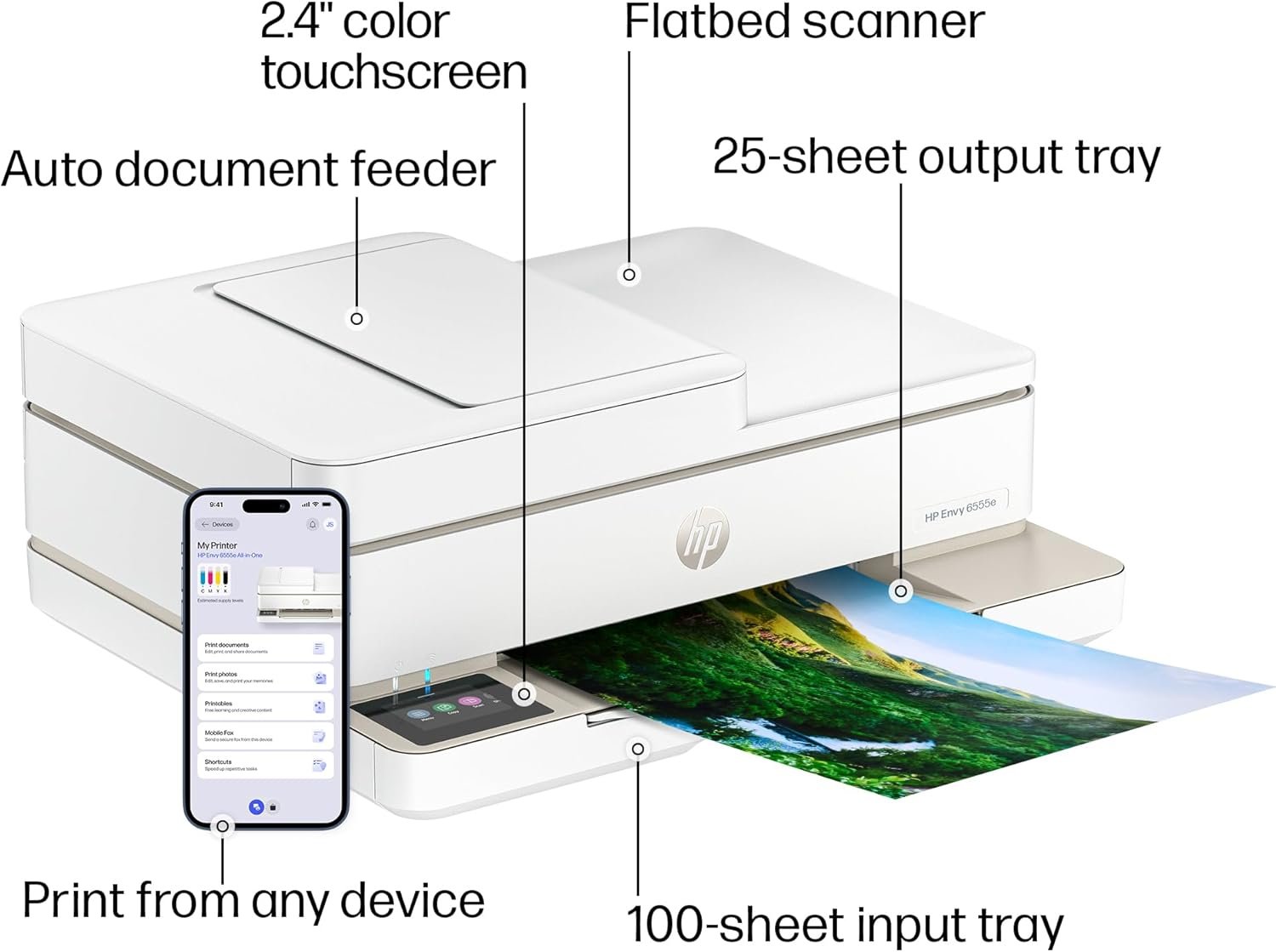 - The HP Envy 6555e All-in-One delivers color printing, scanning and copying, plus a 35-sheet auto document feeder and 100-sheet paper capacity. It includes wireless and mobile printing capabilities to keep your multifunction printer connected, and prints high-quality documents and photos every time with true-to-screen tech. This inkjet printer also lets you easily navigate print jobs with its intuitive color touchscreen.