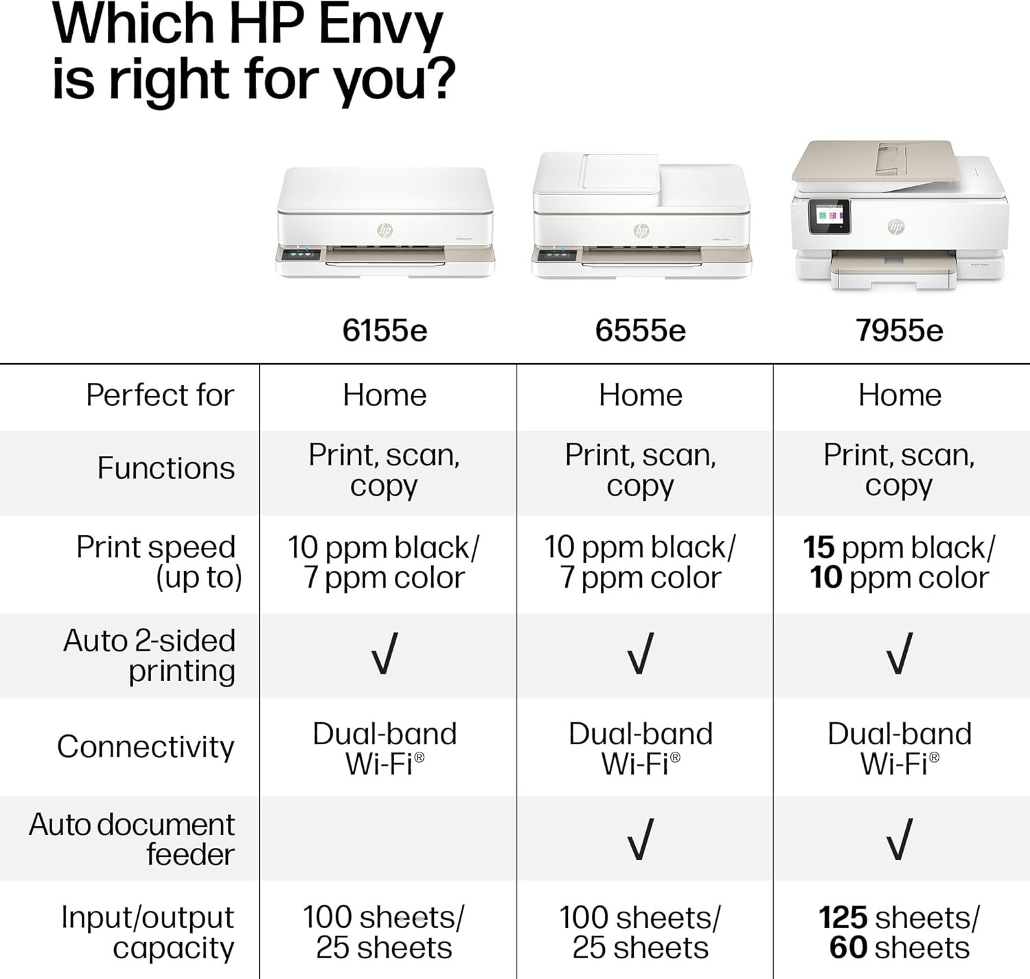 - FROM AMERICA’S MOST TRUSTED PRINTER BRAND – The Envy 6555e is perfect for homes printing everyday high-quality color documents like homework and borderless photos. Print speeds up to 7 ppm color, 10 ppm black.